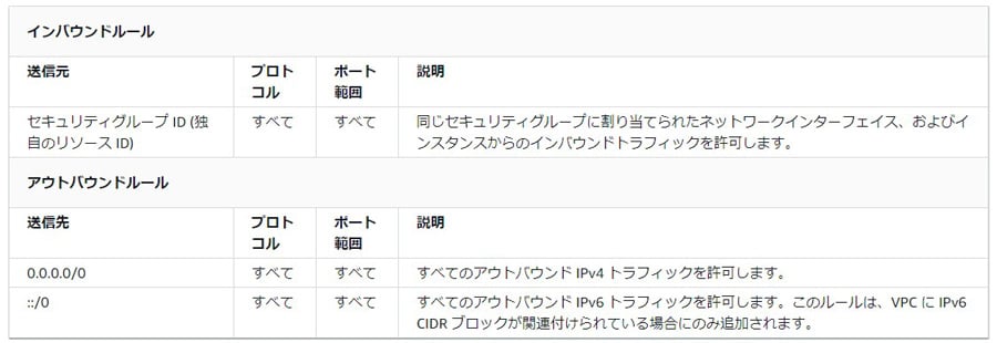 セキュリティグループのデフォルト値は以下のように設定されており、送信元セキュリティグループに関連付けられたネットワークインターフェイスからのトラフィック以外は受信しない形となっています。つまり、追加の設定を行わなければ外部からのトラフィックは一切受け付けないという状態です。一方で、アウトバウンドルールについてはすべてが許可されており、制限は設けられていないことが分かります。