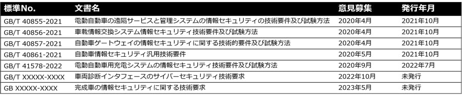 中国においても昨今、数多くの自動車サイバーセキュリティ関連規格の検討プロセスが動いており、2020年に入ってから複数の規格の公開、およびパブリックコメント募集、正式発効など活発な動きがみられます。そして2023年5月には、UN-R155をベースとした自動車セキュリティ法規の意見募集稿が公開されました。