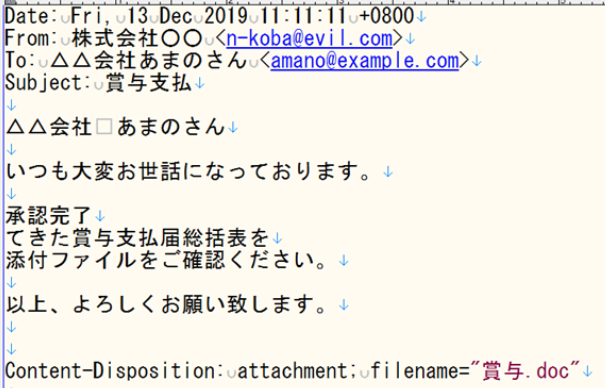 Emotet感染を誘導するメールのもう1つの特徴として、12月に入り「賞与」に関する文面を記載するものが出現したことが挙げられます。図7に、賞与支払いを騙りEmotetを誘導する不審メール例を示します。