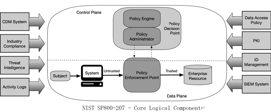 ここまでは広く知られた内容かと思いますが、本稿では更に踏み込んでゼロトラストのアーキテクチャを考えてみます。ゼロトラストの定義を述べたドキュメントの一つとして、NIST(National Institute of Standards and Technology)から発行された「NIST SP800-207」[ii]がありますが、そこでは以下に示す「Core Logical Component」が定義されています。
