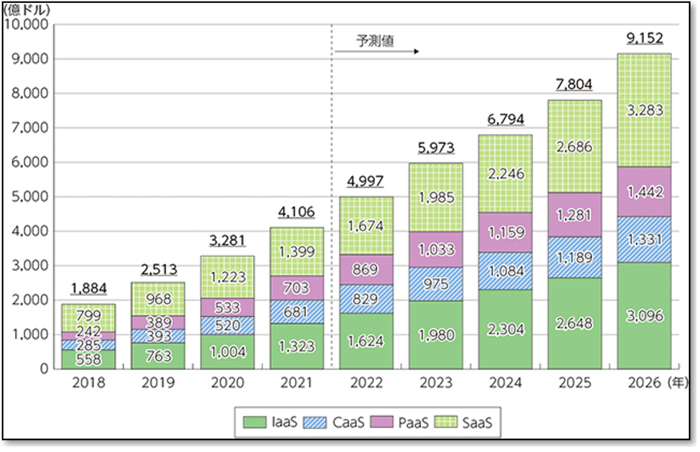 世界のパブリッククラウド市場規模は年々拡大しています。総務省の発行する情報通信白書令和5年度によると、図に示す通り、2021年には前年度比28.6%増の4106億ドル(当時のレートで45兆621億円相当)となっており、予測値ではありますが2026年にはさらにその倍以上の9152億ドル[1]と、引き続き需要が増える傾向が続くとみられています。すでに、クラウド環境を対象にした攻撃は多く確認されており、クラウド市場の拡大に伴い、クラウド環境を狙う攻撃が今後さらに増加していくと考えられます。