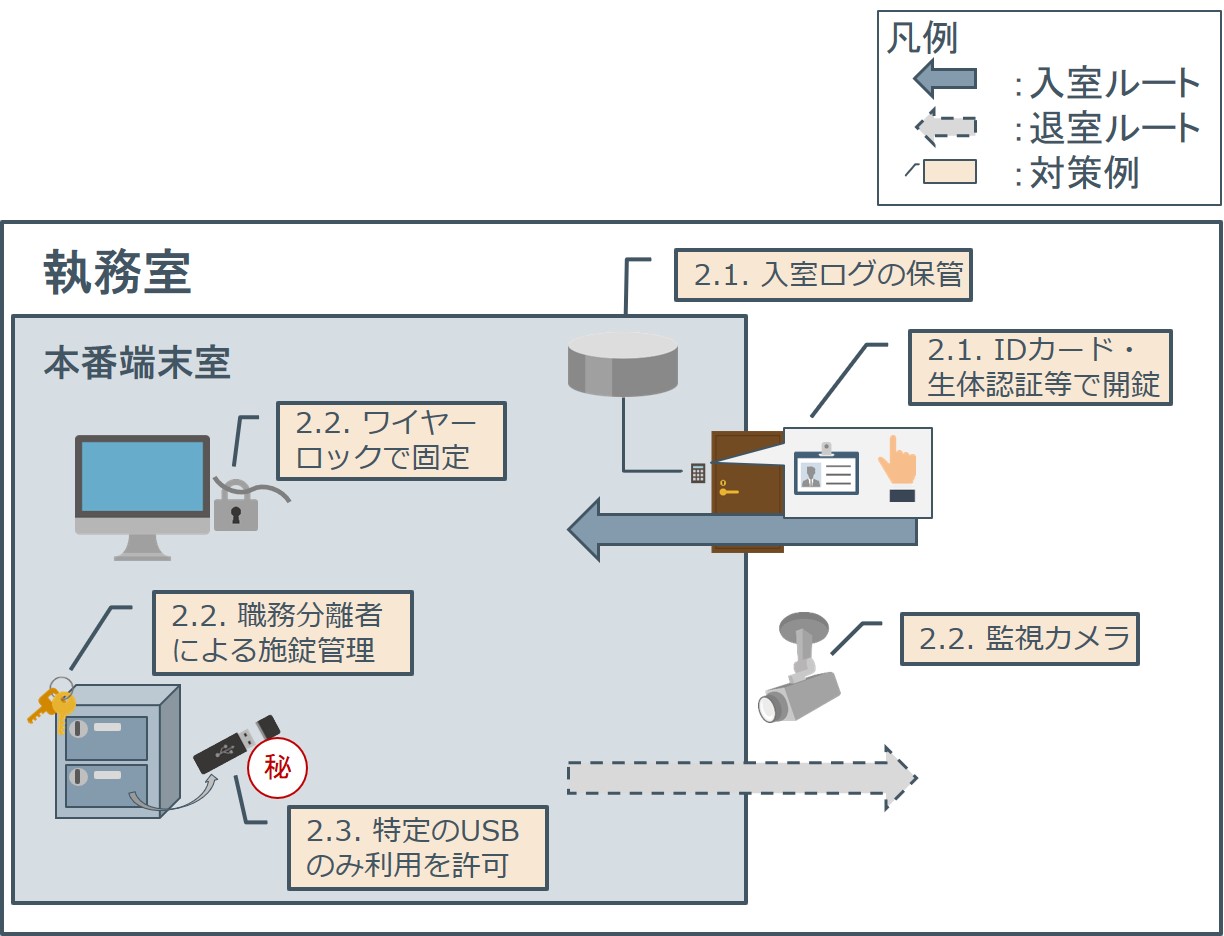 また、本番端末室の入退室者の顔が確認できるよう監視カメラを設置し、持ち出しを牽制することも有効です。