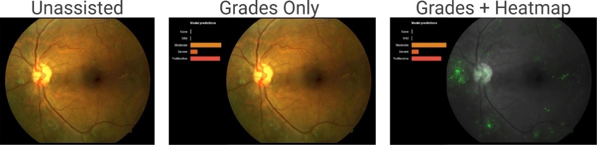 (出典) Rory Sayres, Ankur Taly, Ehsan Rahimy, Katy Blumer, David Coz, Naama Hammel, Jonathan Krause, Arunachalam Narayanaswamy, Zahra Rastegar, Derek Wu, Shawn Xu, Scott Barb, Anthony Joseph, Michael Shumski, Jesse Smith, Arjun B. Sood, Greg S. Corrado, Lily Peng, Dale R. Webster, “Using a Deep Learning Algorithm andIntegrated Gradients Explanation to AssistGrading for Diabetic Retinopathy”, https://www.sciencedirect.com/science/article/pii/S0161642018315756