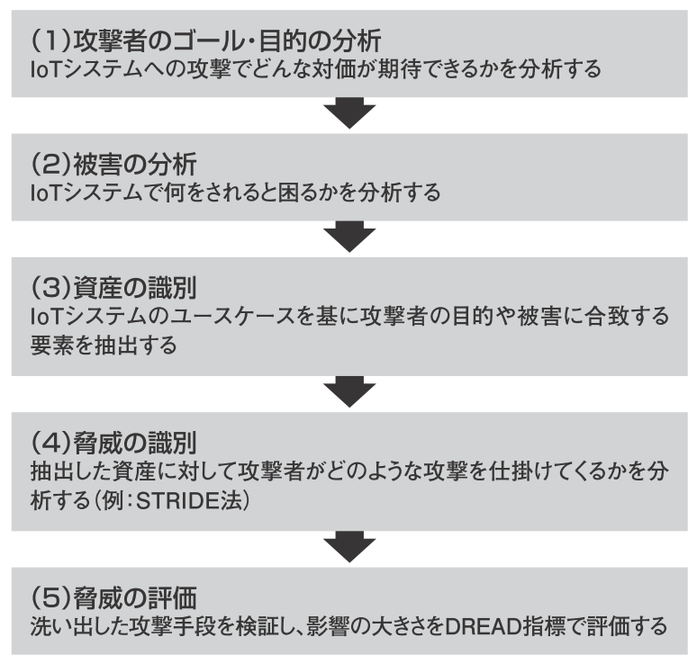 脅威分析の一般的な流れは、①攻撃者のゴール・目的の分析、②被害の分析、③資産の識別、④脅威の識別、⑤脅威の評価、という5つのステップで構成されます。