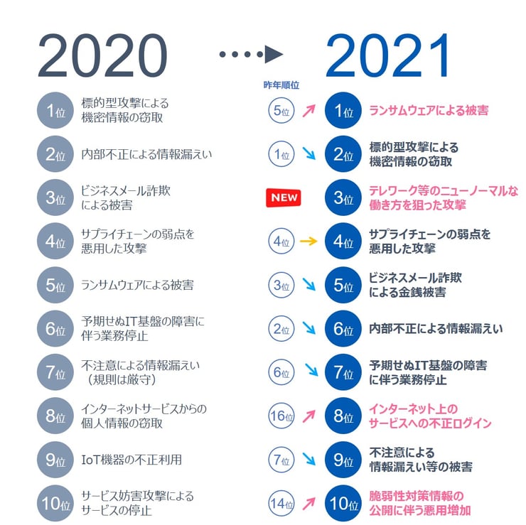 図:情報セキュリティ10大脅威「2020」と「2021」の比較
