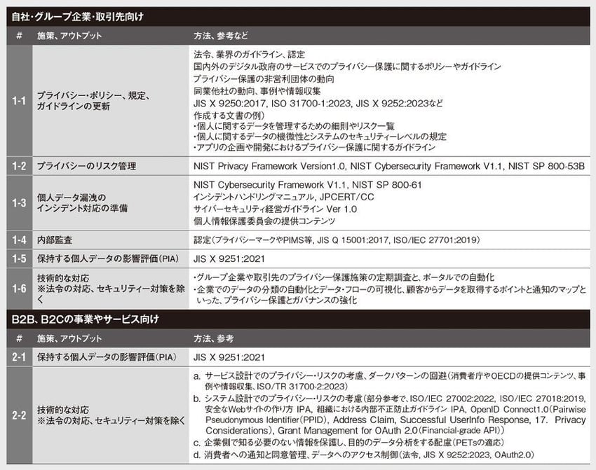 プライバシー保護の主な施策(施策に付随する教育は含まない)|プライバシー保護で参考になる文書