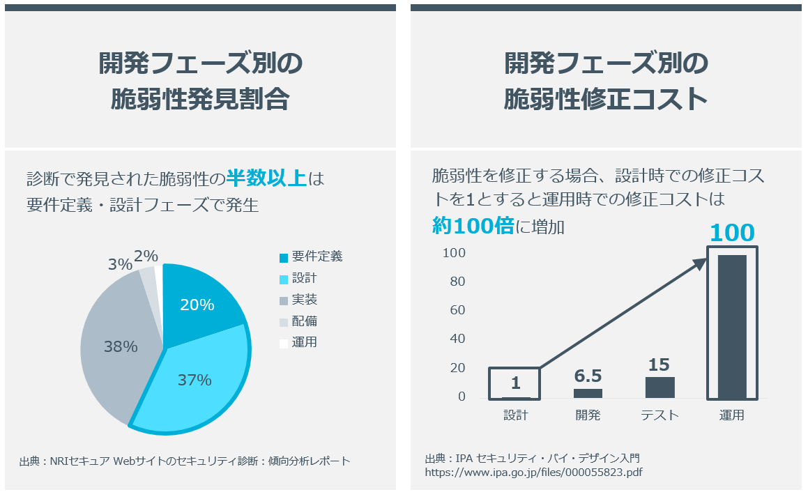実際に、NRIセキュアで実施したセキュリティ診断の傾向を分析すると、約3割のWebアプリケーションで重要情報の窃取に繋がる危険な脆弱性が発見されています。診断で発見された脆弱性の半数以上は要件定義・設計フェーズで作りこまれています。脆弱性を修正する場合、設計時での修正コストを1とすると運用時での修正コストは約100倍に上ります。