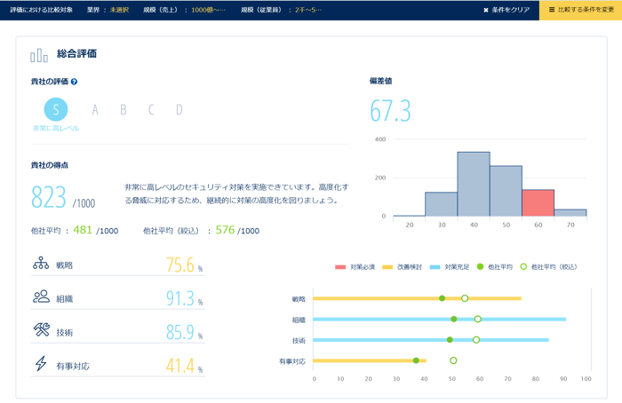 NRIセキュアが保有する800社以上の企業データを元に、「業種」「売上規模」「従業員規模」の属性で絞り込んだ企業の平均と自社の結果を比較できます。これにより、同業種・同規模の企業のセキュリティレベルを踏まえたうえで、今後自社がとるべきセキュリティ対策を検討することができます。