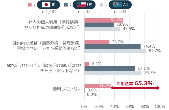 生成AIの活用用途について尋ねたところ、日本では社内の個人利用が最も多く(51.4%)、問い合わせチャットボットなどを含む顧客向けサービスで活用していると答えた割合は6.3%にとどまりました(図1)。一方、米・豪では社内向け業務や顧客向けサービスでの活用が多く、日本と比べて活用用途に違いがあることが浮き彫りになりました。また、「活用していない」と回答した割合から、何らかの形で活用している企業は、日本では65.3%であったのに対し、米国は99.2%、豪州は100%と、ほとんどの企業で生成AIを活用していることが分かりました。