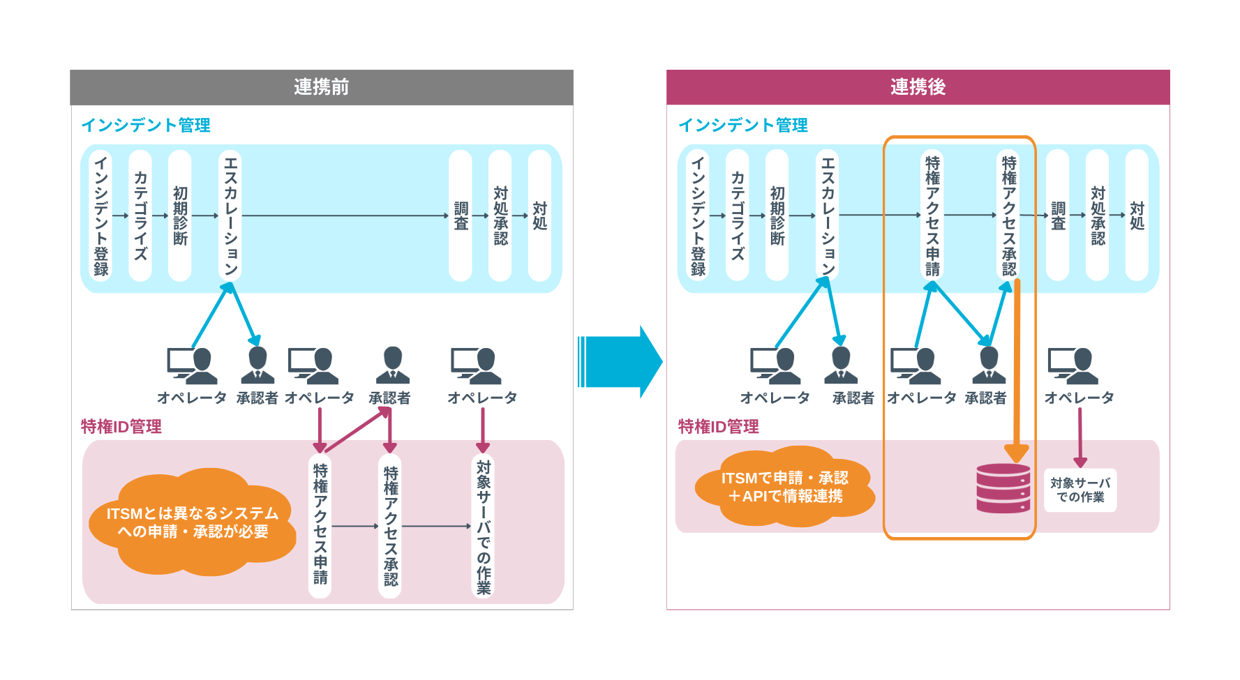 ※以下の図は、特権IDを利用するインシデント管理業務を例に、連携する場合としない場合の違いを示したものです