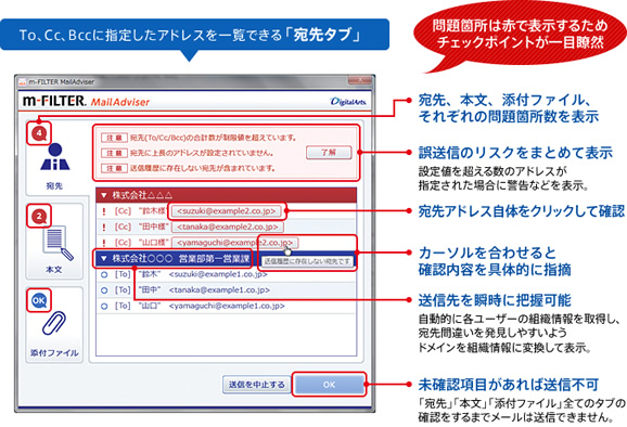 m-FILTER MailAdviserは直感的操作で簡単に確実に誤送信を防ぐ、メール誤送信防止ソリューションです。