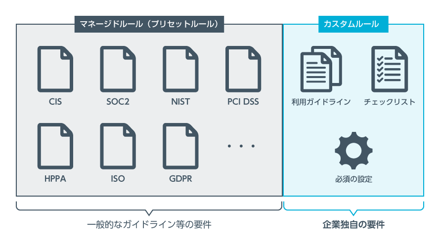※対応するセキュリティ基準例…GDPR(EU一般データ保護規則)、NIST CSF(NISTサイバーセキュリティフレームワーク)、PCI-DSS、ISO27001、CISベンチマークなど